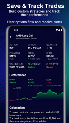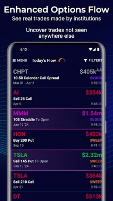 Another unique feature of this application is the Unusual Options Flow. This tool scans the market to uncover large and unusual trades as they happen, providing insight into trades made by institutions and other smart money. Not only does it show large call or put purchases, but it also detects urgency or aggression from the buyer or seller, giving users a comprehensive view of the market.