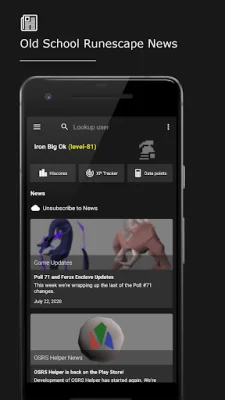 In addition to these features, the app also keeps you updated on OSRS news and notifies you in near-realtime of new blog posts. You can also browse the worldmap and view pre-defined points of interest.