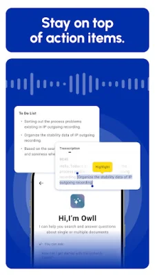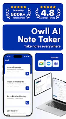 Owll's key features include AI-powered recording, summaries, and to-dos. With just one tap, users can record using Owll's AI note taker and built-in AI Coach. The app supports voice recorder mode, speech-to-text, voice transcription, and audio file imports, and then generates concise takeaways and to-do lists to ensure nothing gets missed. Additionally, Owll offers transcription for online meetings, making it easy to stay focused with real-time transcription and clear meeting notes.