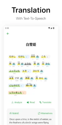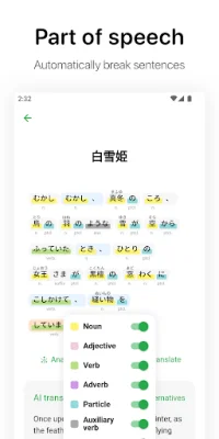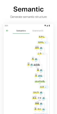 Oyomi is an innovative application that utilizes machine learning to enhance your reading experience. By automatically breaking down sentences and identifying the parts of speech and pronunciation of Chinese characters, Oyomi helps improve your reading efficiency. This feature is especially useful for those learning Chinese as a second language. In addition to its part of speech analysis, Oyomi also offers semantic analysis. By combining machine learning techniques, it accurately analyzes and generates the semantic structure of sentences and paragraphs. This allows for a better understanding of the grammatical characteristics and meanings of Japanese. Oyomi also helps sort out the modification relationship between short sentences, making it easier to comprehend complex sentences. Another useful feature of Oyomi is its online translation function. With its accurate translation capabilities, Oyomi can quickly translate text and even perform text-to-speech. This makes it a valuable tool for those who need to read or understand Japanese content. Oyomi also serves as a web content analyzer, allowing users to parse the content of web pages for analysis. It can also import EPUB e-books, making it a convenient tool for reading digital books. With its built-in dictionary, Oyomi can automatically analyze the conjugations of words. This feature is especially helpful for language learners who struggle with verb conjugations. To aid in language learning, Oyomi offers a vocabulary notebook where users can bookmark their favorite paragraphs and new words. This allows for easy review and study of previously encountered words and phrases. For those interested in learning Japanese, Oyomi offers a well-designed interactive course with common grammar references. This makes it a valuable resource for beginners and advanced learners alike. In addition to its language learning features, Oyomi also offers content recommendations such as classic novels and music appreciation. These recommendations are occasionally updated with selected content, providing users with a diverse range of materials to explore. Oyomi is constantly developing new features and content to enhance the user experience. If any problems are encountered, users can utilize the "Feedback" feature within the app or contact [email protected] for support. With its advanced features and user-friendly interface, Oyomi is a must-have for anyone looking to improve their Japanese language skills.