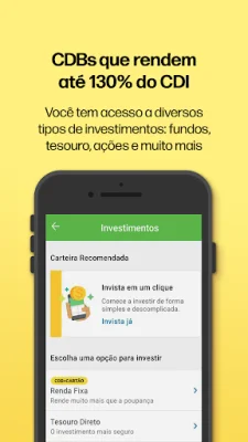 O aplicativo também oferece diversas opções de investimentos, como CDBs que rendem mais que o dobro da poupança, com resgate a qualquer momento e aplicação a partir de R$1,00, Tesouro Direto, Fundos de Investimentos, Ações e outros. O usuário também tem acesso a carteiras sugeridas e conteúdos relacionados à educação financeira para auxiliar na tomada de decisão sobre os melhores investimentos para seus objetivos.