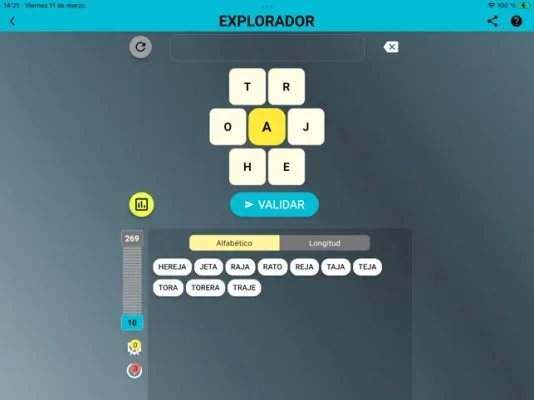 Explorador es una aplicación que te permite descubrir nuevas palabras en español combinando 7 letras. Está inspirada en el popular juego de palabras "Spelling Bee" del periódico The New York Times. Su objetivo principal es fomentar el aprendizaje de vocabulario en español y su definición en el diccionario de la Real Academia Española (RAE). Con esta aplicación, podrás poner a prueba tus habilidades lingüísticas mientras te diviertes jugando.