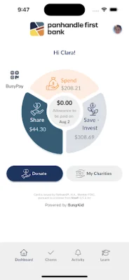 BusyPay is another convenient feature of our app, allowing friends and family to add money to a child's account for special occasions or for completing tasks for neighbors. Kids can also use BusyPay to send money to others using BusyKid. And for those who want to give back, the app offers the option to donate a portion of their allowance to over 60 charities.