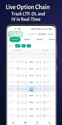 The app also offers a live option chain feature, where users can view real-time Nifty 50 option prices from live NSE market feeds. They can also view call and put option prices, open interest, implied volatility, volume, and change instantly. Users can filter by weekly or monthly expiries and the app will automatically scroll to the At-The-Money strike for quick trading.