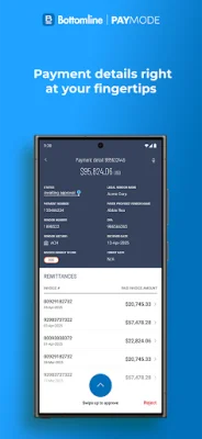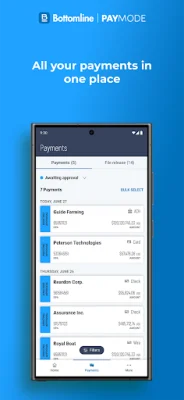 The payer experience application offers a variety of features to make managing payments easier and more efficient. Users can take action on their payments, such as approving or rejecting them, directly from their mobile device. They can also filter payments by various criteria, such as status, date, account, and payment method.
