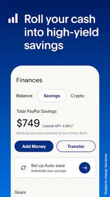Grow your money with high-yield savings through PayPal Savings. You can earn a current 4.30% APY, which is 9 times the national average. Easily manage your account and track your progress towards your savings goals right from the app. Please note that the APY is variable and can change at any time. PayPal is not a bank, but banking services are provided by Synchrony Bank. A PayPal Balance account is required to use PayPal Savings.