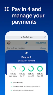 Pay in 4 with PayPal allows you to buy now and pay later by splitting your purchase into 4 interest-free payments at millions of online retailers. You can easily manage your payments in the app, and it is available for purchases of $30 - $1500 upon approval. This feature is not currently available for residents of MO or NV, and you must be 18 years or older to apply. PayPal, Inc. offers loans to CA residents, and is licensed in GA and RI. For more information, visit paypal.com/payin4.