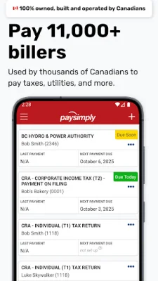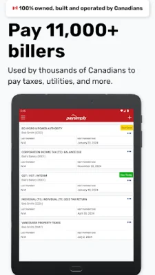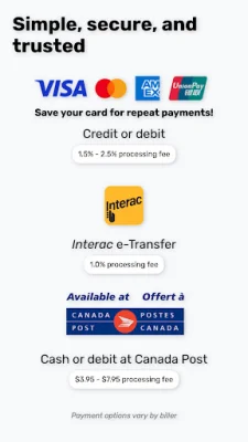 PaySimply is a convenient and secure application that allows you to pay over 11,000 different types of taxes and bills. This includes a wide range of payments such as tuition, utilities, and more. With PaySimply, you have the flexibility to choose the payment method that works best for you, whether it's through credit or debit card, INTERAC e-Transfer®, or even cash or debit at any Canada Post location.