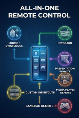 In addition to these input methods, the app also offers shortcuts for quick actions, such as creating custom keyboard shortcuts. You can also use Bluetooth PC Master to control your media player, navigate presentations, and even perform system functions like locking, sleeping, restarting, or shutting down your PC.