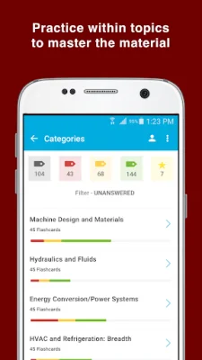 The free version includes a limited amount of practice questions and basic progress metrics. However, for the best value, users can subscribe to the Premium Version which includes access to 360 cards containing key information in question form, exam tips and strategies, and the ability to flag cards for later review. The app covers all exam categories, including General Knowledge, Codes, and Standards, Machine Design and Materials, Hydraulics and Fluids, Energy Conversion/Power Systems, HVAC and Refrigeration, and more.
