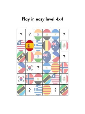 This game offers a variety of image categories to choose from, including Animals, Travel, Fruits, Flags, Vehicles, Japan, and Spring. Players can select from two levels of difficulty: Normal, which features a 4x4 grid and 8 pairs to find, or Hard, which has a 6x6 grid and 18 pairs to find.