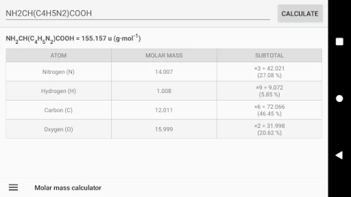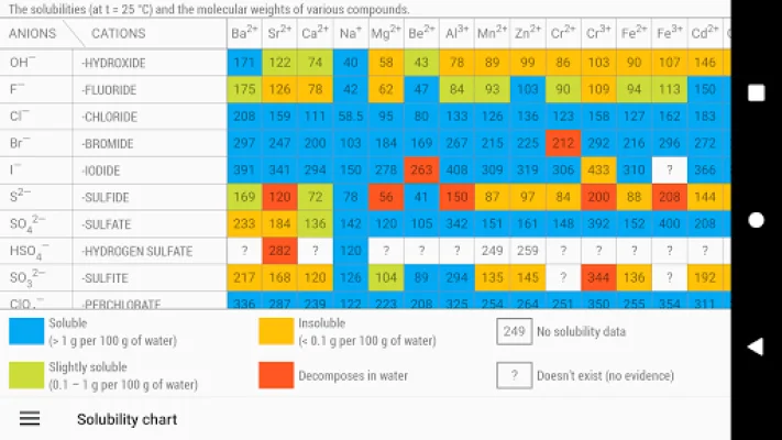Aside from the comprehensive information about chemical elements, the application also includes other useful features such as photos of elements, a list of isotopes and their properties, a solubility table for salts, acids, and bases, and a molar calculator. These tools are essential for studying chemistry and can help with exams, laboratory work, and general learning.