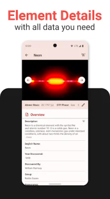 The application provides in-depth information about each element, including atomic number, weight, discovery details, group, appearance, isotope data, density, electronegativity, electron shell details, boiling and melting points, electron configuration, ion charge, ionization energies, atomic and covalent radii, and more. Users can also customize their experience by prioritizing their favorite element details and taking notes for each element. The offline mode allows users to save data and work without an internet connection.