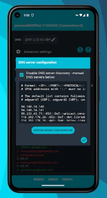 personalDNSfilter is an app designed for Android devices that acts as a DNS filter. This means that it intercepts and blocks access to certain websites or domains based on a list of filtered hosts. These hosts can include those related to malware, phishing, tracking, and more. The app can be used to protect your device from accessing these harmful sites and can also serve as a DNS changer, allowing you to set your own trusted upstream DNS server.