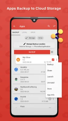 Apps can be backed up as APK files to both local storage and the cloud. When restoring apps, the app will automatically reinstall all selected apps. Users can also check the size of apps, share APKs with friends, uninstall apps, launch apps, backup apps, and view app information. The app also allows for the backup and restoration of calendar events and call logs.