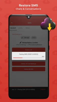 Contacts can be backed up to both local storage and the cloud, and users can choose to restore from either location. The app can backup just phone numbers or more detailed information such as addresses and emails. SMS and conversations can also be backed up and restored, with a progress bar showing the number of messages and conversations being backed up.