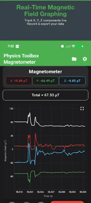 This application offers four powerful view modes for users to visualize and analyze magnetic fields. The first mode, Chart View, displays a live graph of the magnetic field strength over time across different axes and total magnitude. The second mode, Multi Graph, allows users to compare all axes simultaneously in a multi-panel display. The third mode, Digital Readout, provides a clean numerical interface for precise real-time measurements. Lastly, the 3D Compass mode allows users to visualize the direction of the magnetic field in three dimensions.
