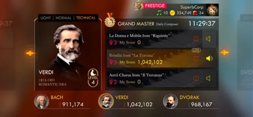 Pianista is a free-to-play mobile application that allows users to play iconic pieces of classical music from the world's greatest composers. The app is optimized for easy thumb play and offers various options such as different speeds and fade in-out options. It is a game for everyone, with songs ranging from easy to extreme difficulty levels. Users can challenge themselves by completing songs and progress through different stages in the Tour mode to become a virtuoso.