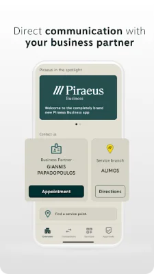 The new Piraeus Business application has been redesigned to provide users with an improved banking experience. The app offers a modern, upgraded, and user-friendly interface that is easy to navigate. From the dashboard page, users can access an overview of their recent transactions, transactions for approval, and initiate new transactions. Additionally, users can schedule online appointments with their business partner at Piraeus Bank. The dashboard page also features a section called "Piraeus in the spotlight" which showcases propositions that promote the user's banking relationship.