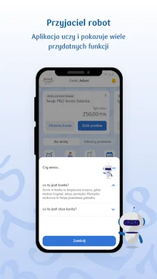 W aplikacji znajduje się mówiący robot, który pomaga dziecku uczyć się o finansach i daje mu wskazówki. Dziecko może również inicjować przelewy i doładowania telefonu, jednakże rodzic musi je zaakceptować w swoim serwisie internetowym iPKO. Dodatkowo, dziecko może poprosić rodzica o zasilenie swojej karty płatniczej.