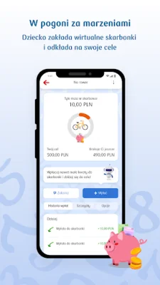 Aplikacja umożliwia również założenie wirtualnych skarbonek, w których dziecko może określić cel, na który chce zbierać pieniądze. Skarbonki te można w dowolnym momencie doładować, edytować lub rozbić. Dzięki kalkulatorowi oszczędności, dziecko może obliczyć, ile potencjalnie może zaoszczędzić, uwzględniając wysokość i regularność wpłat oraz aktualne oprocentowanie.