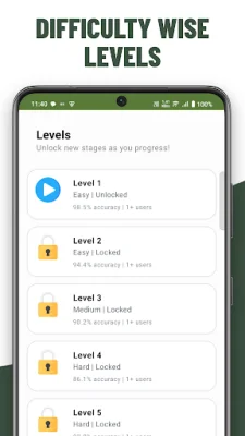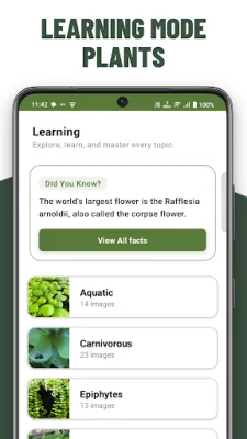 Unlock the learning mode to discover amazing facts about plants and their unique traits. You can also track your progress and achievements, including your accuracy, number of attempts, streaks, and badges. The app also offers difficulty levels, allowing you to progress from easy to medium to hard as your accuracy improves.