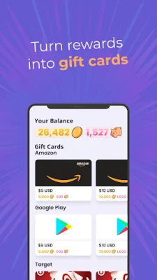 This application allows users to earn coins and piggy banks by participating in various activities such as downloading, playing, and purchasing new games. These rewards can then be redeemed for gift cards to popular retailers like Google Play, Amazon, and Target. This provides users with a fun and easy way to earn rewards that can be used towards their favorite products and services.