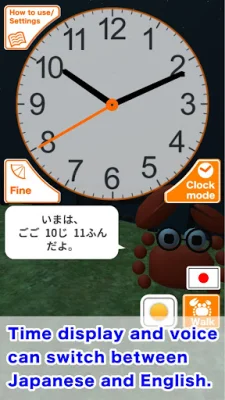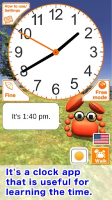 The application is a fun and interactive way to experience the changing of the sun and sky according to the time. It features a character named Mr. Megani who can be controlled to move to different locations. The main function of the app is to allow users to manipulate the clock hands and tap on various elements to display and listen to the time. The app also offers the option to switch between Japanese and English for the time display and voice.