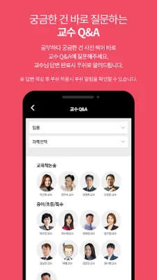 교수 Q&A 메뉴에서는 텍스트나 사진을 첨부하여 간편하게 질문할 수 있으며, 강의, 교재, 학습방법 등에 대한 질문에는 교수님이 직접 답변해줍니다. 교수님의 답변이 완료되면 푸시 알림을 받을 수 있습니다. (질문 작성 후 푸시 설정 필수)