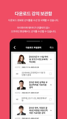 다운로드 파일관리 메뉴에서는 다운로드한 강의를 수강할 수 있으며, 인터넷 환경이 원활하지 않거나 Wi-Fi와 데이터가 연결되지 않은 오프라인 환경에서 유용하게 사용할 수 있습니다. 또한 다운로드 진행함에서는 강의 다운로드 상황을 확인하고 일시정지 및 재 다운로드를 진행할 수 있습니다.