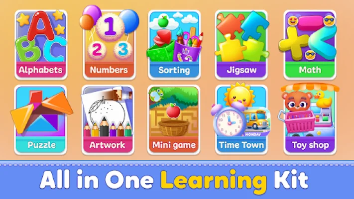 The app covers a wide range of learning topics, including alphabets and phonics, numbers and counting, sorting and categorizing, jigsaw and puzzle games, math games and activities, artwork and coloring, time learning, and multiple mini-games. Each activity is designed to be age-appropriate and to enhance different skills such as letter recognition, logic, problem-solving, creativity, and coordination.