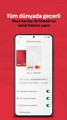 Poca, dijital bir cüzdan ve kart olarak kullanılabilir. Uygulamayı indirerek hemen hesabınızı açabilir ve dijital cüzdanınızı kullanmaya başlayabilirsiniz. Ayrıca tamamen ücretsiz olan Poca ön ödemeli dijital kartınız ile internet alışverişlerinizi güvence altına alabilirsiniz. İsminize özel basılacak Mastercard logolu Poca ön ödemeli kartınız ile dünyanın her yerinde temassız harcama yapabilir ve Türkiye'deki tüm ortak ATM'lerden nakit çekim yapabilirsiniz.