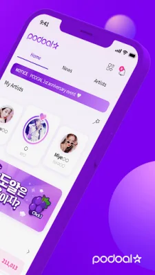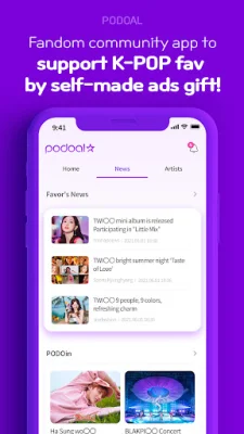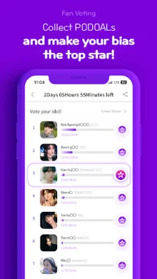 In addition to voting, the app also offers real-time "Fan Voting." By using PODOALs obtained through free charging, fans can gift special ads to their bias. The winning idol will then shine on the global spotlight, making this a great way to show your support and help your favorite artist gain recognition.