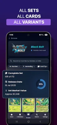 CollectDeck also offers a comprehensive search function, allowing users to easily find specific cards from tens of thousands of options. The app also allows for filtering by set, rarity, type, or artist, making it easy to organize and track set completion. The clean card index and progress bars make it simple to see which cards are still needed to complete a set.