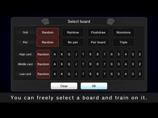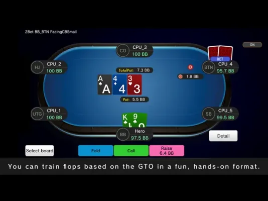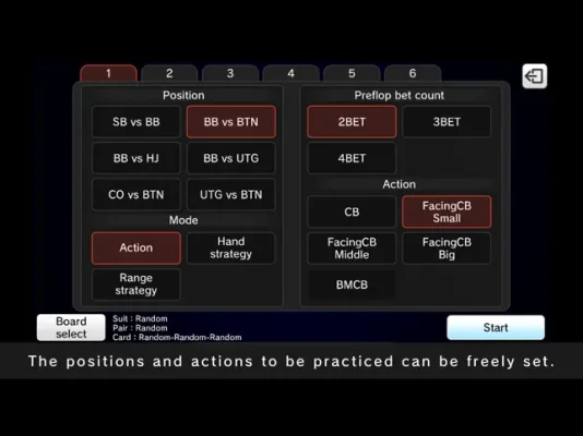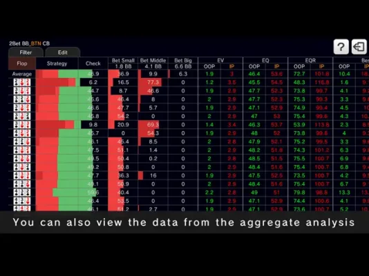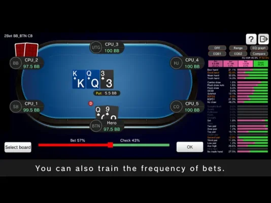 The upgraded version of this application now allows users to view data from aggregated analysis. This means that players can now access a wider range of features and tools to improve their gameplay. Some of the main features include the ability to play with different board textures such as "Monotone Board", "A High Board", "Pair Board", and "Specify all 3 cards". Users can also train their skills in CB, FacingCB, and BMCB with three different bet sizes available - small, medium, and large. Additionally, players can specify the frequency of their actions as a percentage, allowing for more personalized training. For example, a user can set their betting frequency at 62% and checking frequency at 38%. The hint function also provides a multi-perspective training experience, including options such as "looking at each other's ranges," "looking at EQB," and "looking at the number of draw combos."