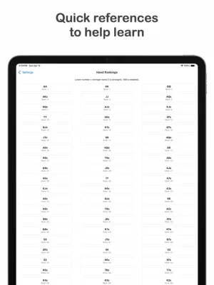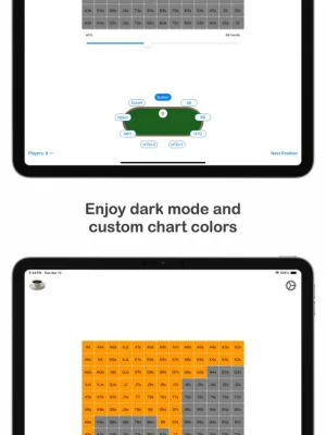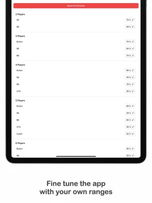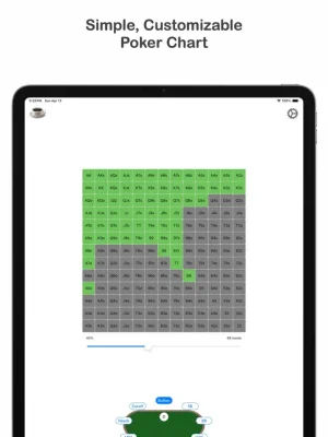This application is a user-friendly RFI hand chart designed specifically for Texas Hold'Em players. It features a convenient slidable bar that allows users to adjust the percentage of hands they want to play. This makes it easy for players to customize their gameplay and make strategic decisions based on their preferred hand range.