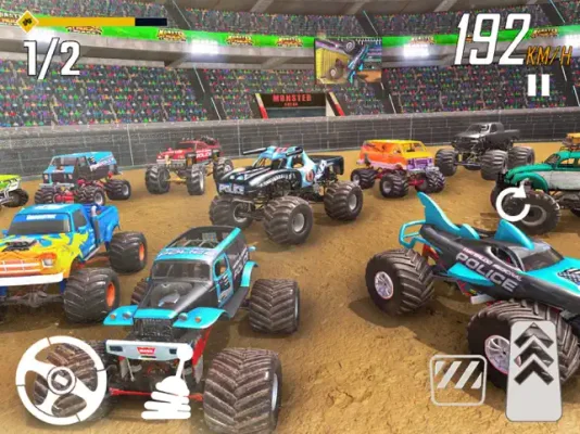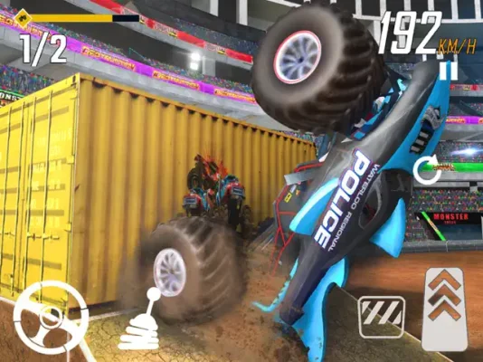 The game features a variety of arenas where players can show off their stunts and engage in intense battles with enemy vehicles. Each arena offers a unique environment and challenges, keeping the gameplay fresh and exciting. Players can also choose from multiple monster trucks in the vehicle selection, each with its own unique abilities and characteristics.