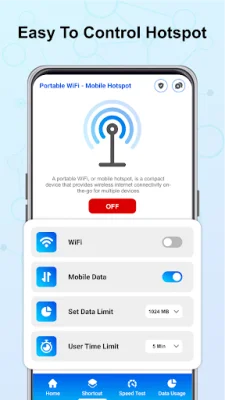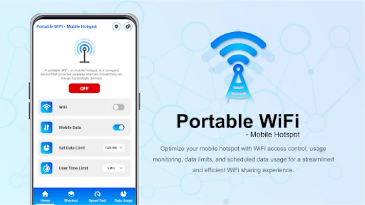 A mobile hotspot app called Portable WiFi is designed to make it easy for users to turn their phone into a powerful mobile hotspot. This app allows you to set a timeout for the hotspot, monitor your internet usage, and check the speed of the hotspot. It is user-friendly and provides the best possible experience for its users.