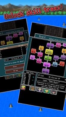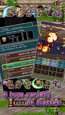 This application is a retro RPG game that features high-quality pixel art and a modern game system. Players can choose from over 20 different classes that can be changed during combat, and unlock boards to strengthen their stats and learn special skills. Formations are also important in turn-based battles, and players must clear various in-game conditions to earn rewards.