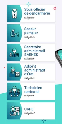 Les concours de la fonction publique proposés sur l'application sont variés et couvrent différentes catégories : Attaché territorial (cat. A), ATSEM (cat. C), Sous officier de la gendarmerie (cat. B), CRPE, Gardien de la paix (cat. B), Gardien brigadier, Secrétaire administratif SAENES, Adjoint Administratif d'État, Rédacteur territorial, Sapeur-pompier, Adjoint administratif territorial, Technicien territorial et Gardien Brigadier.