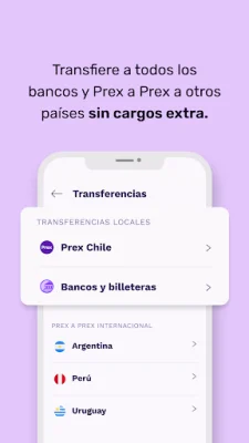 Otra ventaja de Prex es que ofrece transferencias instantáneas a todos los bancos de forma gratuita, tanto dentro de Chile como a otros paÃses como Argentina, Perú y Uruguay. También cuenta con una tarjeta prepago Mastercard y una cuenta digital totalmente gratuitas, sin comisiones ni costos de mantenimiento.