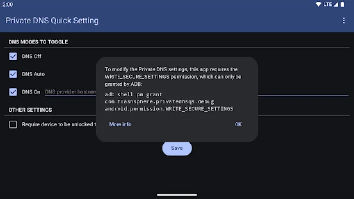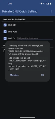Alternatively, you can use ADB (Android Debug Bridge) to grant the permission. This can be done by using the command: adb shell pm grant com.flashsphere.privatednsqs android.permission.WRITE_SECURE_SETTINGS. For more detailed instructions on how to use ADB to grant this permission, you can visit https://private-dns-qs.web.app/help.