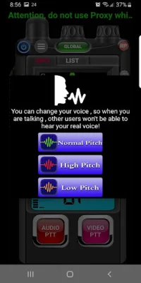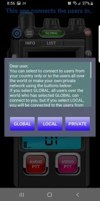 The app has two PTT (Push-to-Talk) buttons, one for audio only and the other for both audio and video. This allows users to choose how they want to communicate with others on the app.