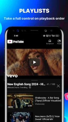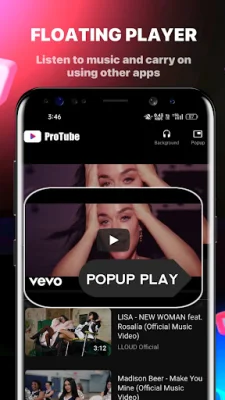 The ProTube app, also known as MusicTube, is a music and video streaming application that allows users to access all YouTube videos and play them in a floating pop-up for a multitasking experience. With this app, users can search for their favorite videos, create playlists, and discover new video genres. They can also browse the daily top trends in their country and watch unlimited videos without any interruptions from ads. The app offers the option to watch videos in full-screen or floating pop-up mode, which stays on top of the screen for easy access. Users can also customize the size and position of the pop-up player according to their needs.