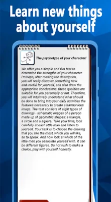 This application offers a variety of psychological tests that can help you gain insight into your character, willpower, and strengths and weaknesses. Unlike the Luscher color test, which focuses on color, these tests require you to focus on the drawing that you like the most. The collection includes tests that are suitable for both teenagers and adults, with some specifically designed for men or women.