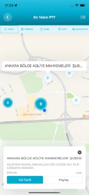 En Yakın PTT özelliği, merkez, şube, ATM ve kargomat noktalarını harita üzerinde görüntülemenizi ve ilgili PTT hizmet noktasına rota oluşturmanızı sağlar. Oluşturduğunuz rotayı paylaşabilir ve açık adresleri görüntüleyebilirsiniz.