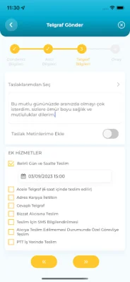 Telgraf Modülü, özel günlerde, tebriklerde ve davetiyelerde kullanabileceğiniz bir uygulamadır. Kolay bir kullanımla giriş yaparak veya giriş yapmadan telgraf gönderebilir, takip ve iptal işlemlerini gerçekleştirebilirsiniz. Veri giriş adımları sayesinde, telgraf gönderme işlemi daha kolay ve hızlı hale getirilmiştir. Ayrıca, kayıtlı metinler ve alıcılar gibi özellikler sayesinde, her seferinde veri girişi yapmadan hızlı bir şekilde gönderi oluşturabilirsiniz.