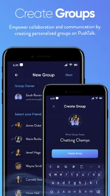 With PUSHTALK, you can also create groups and customize them to your liking, making it easy to keep communication organized. Whether it's a group for friends, family, or coworkers, the customizable features ensure you have control over your communication. As an admin, you can even delete the group if needed.