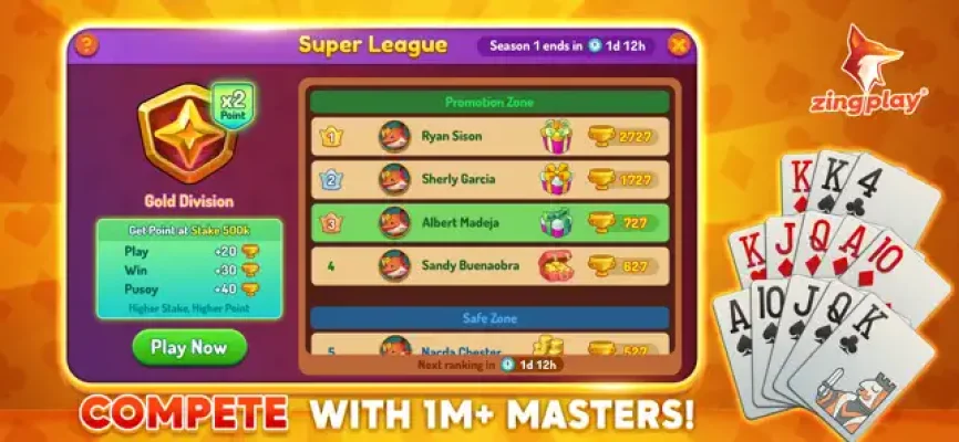 Improve your skills with online Pusoy ZingPlay - Chinese poker (competitive 13 cards game online). This game is intended for adult audiences and does not offer real money gambling. Thank you for playing Pusoy ZingPlay - Chinese poker (competitive 13 card game online), also known as Capsa Susun, Mau Binh in other countries. ZingPlay is committed to providing a go-to gaming platform for Filipinos by Filipinos. Other online card games available include Pasay, Tongits, Pusoy Dos, Lucky 9, Poker, and more. We are always looking to improve and welcome any comments you may have to help us enhance the game. So come and join the fun, be original, and let's play Pusoy!