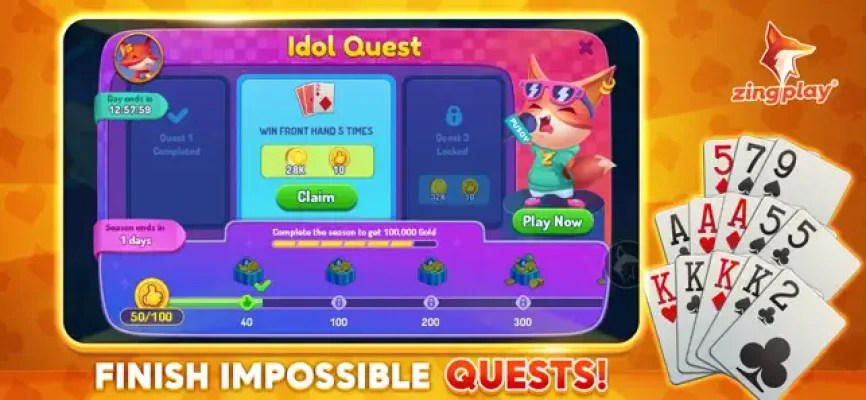 Advance your skills with the series of Idol Quests. Finish all of them, from the easiest one - play 1 match - to the hardest, Pusoy all of the opponents. By completing these quests, you can earn extra gold and continue playing. This is a fun and challenging way to improve your Pusoy skills.